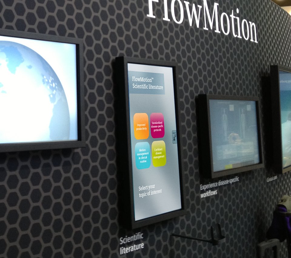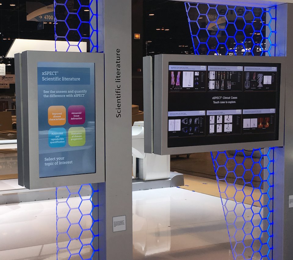 Siemens Healthineers used freestanding kiosks throughout their exhibit spaces for interactive presentations, lead generation, and for promotional purposes.