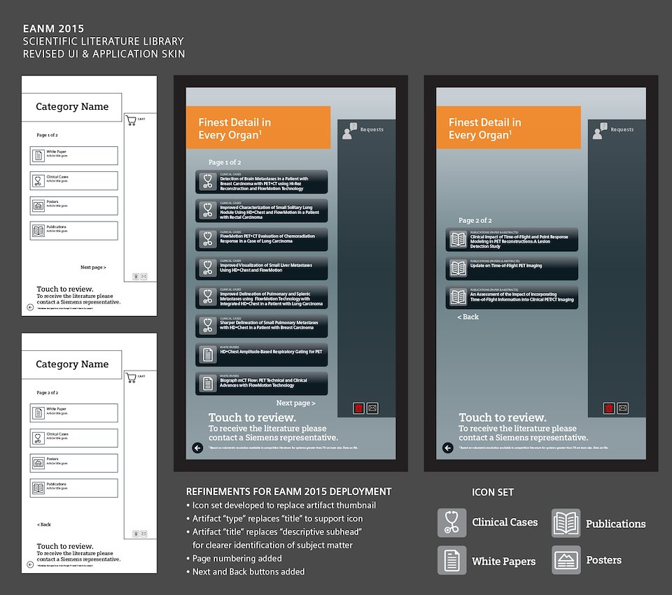 EPILOGUE: Based on the success of the Scientific Literature Library for SNMMI and EANM, Siemens Diagnostics requested their own custom implementation for AACC 2016. Brand design guidelines had changed and the content was different but the basic premise remained. This product was also well received and used throughout the year. Additionally, for SNMMI 2017, a revised product was developed to reflect the new brand design guidelines, and the learnings that occurred over the past 2 years and various implementations.